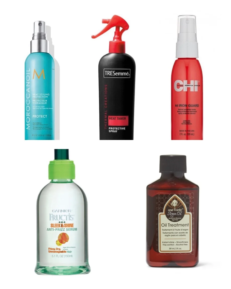 Moroccan oil protect, Tresemme heat tamer, chi iron guard, garner fructis sleek & shine, One N’ only argan oil